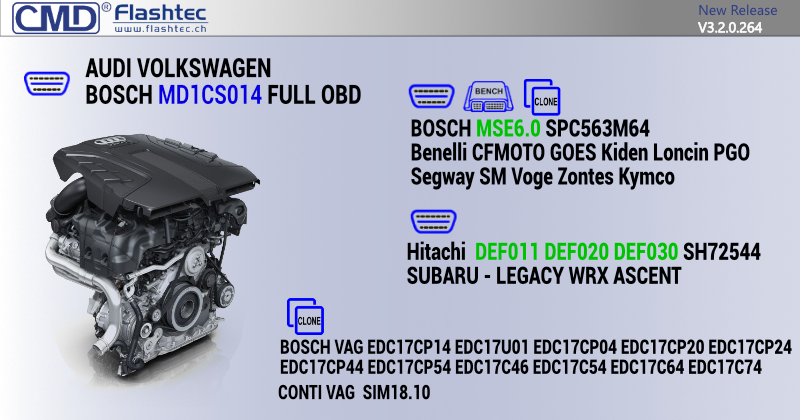 This new OBD protocol allow you to manage the map and firmware areas of Bosch MD1CS025 ECU. The solution operates directly through the diagnostic port.