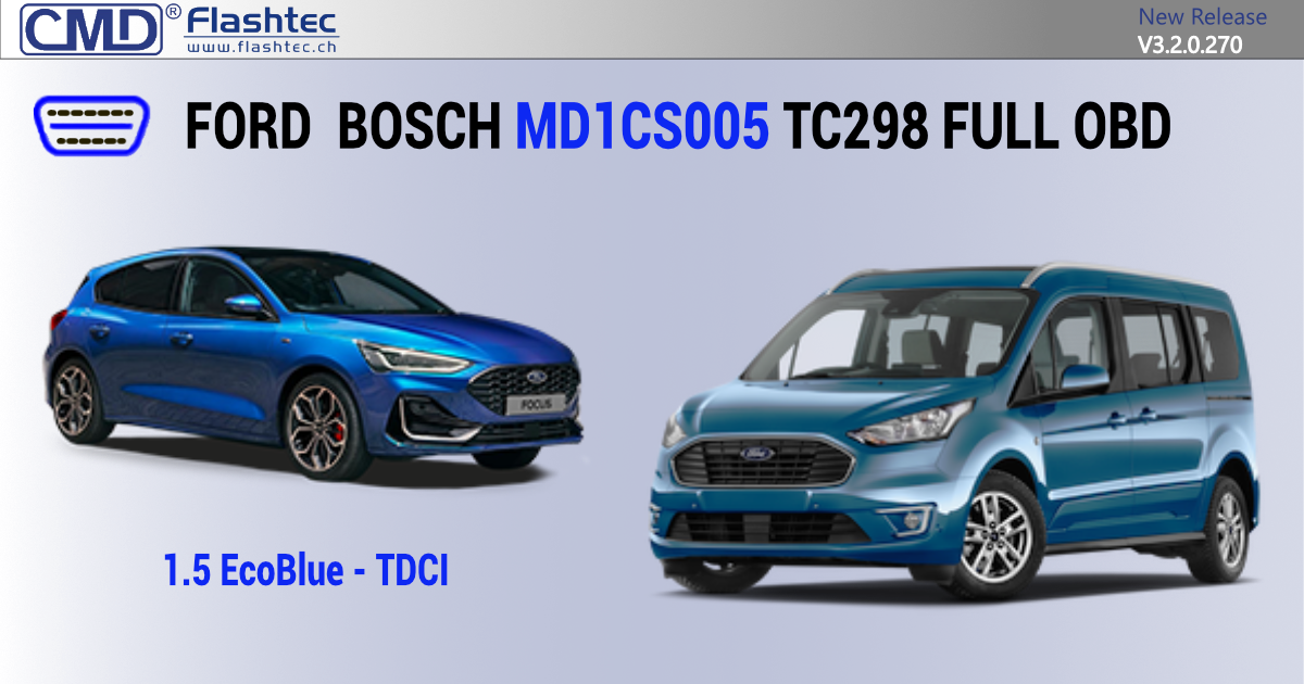 OBD Ford Bosch MD1CS005 FULL OBD (1.5 EcoBlue Engine) This new OBD protocol allows you to manage the map and firmware areas of Bosch MD1CS005 ECUs. This solution works directly through the diagnostic port and is only for ECUs with the latest BENCH anti-tuning protections.