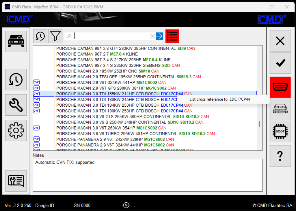 ECU cross referenceRight click on the ECU/TCU model to refine search filterOBD BENCH BOOT access typeThe currently selected access mode is highlighted. You can easily switch to any of the other supported modesNew list mode (BETA)Use this button to access the new, beta version of the protocol selection list.Search boxUse the search bar to quickly locate the specific ECU / protocol you need.Double-Click to select this protocol |